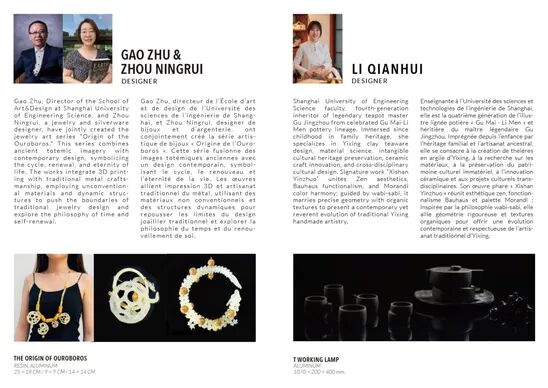 本次展览汇聚了15家中国企业、20位设计师与艺术家,展品涵盖家具、珠宝、陶瓷茶具、环保设计、气味创新、材料工艺等多个领域,全方位呈现中国设计的多样性与创新力。艺术设计学院四件优秀作品从首饰、材料工艺、陶瓷茶具等方面彰显可持续与科技时尚的创新设计理念。作品《衔尾蛇之源》,以跨越文化与时代的符号为核心,探讨在现代社会中对循环性、时间性和自我更新的哲学思考。作品《金钱海棠》从青铜器形制、宋瓷美学、吉祥纹样等文化母体中提取造型元素,融合中国传统文化基因与现代设计语言,寓意“财运亨通,富贵吉祥”。作品《溪山隐座》以侘寂美学为内核,通过几何造型与自然元素(水、光影、土)的结合,实现传统紫砂与现代设计的交融。作品《声形》以光为律,形为序,声为景,将自然造型重构,与声光交织。