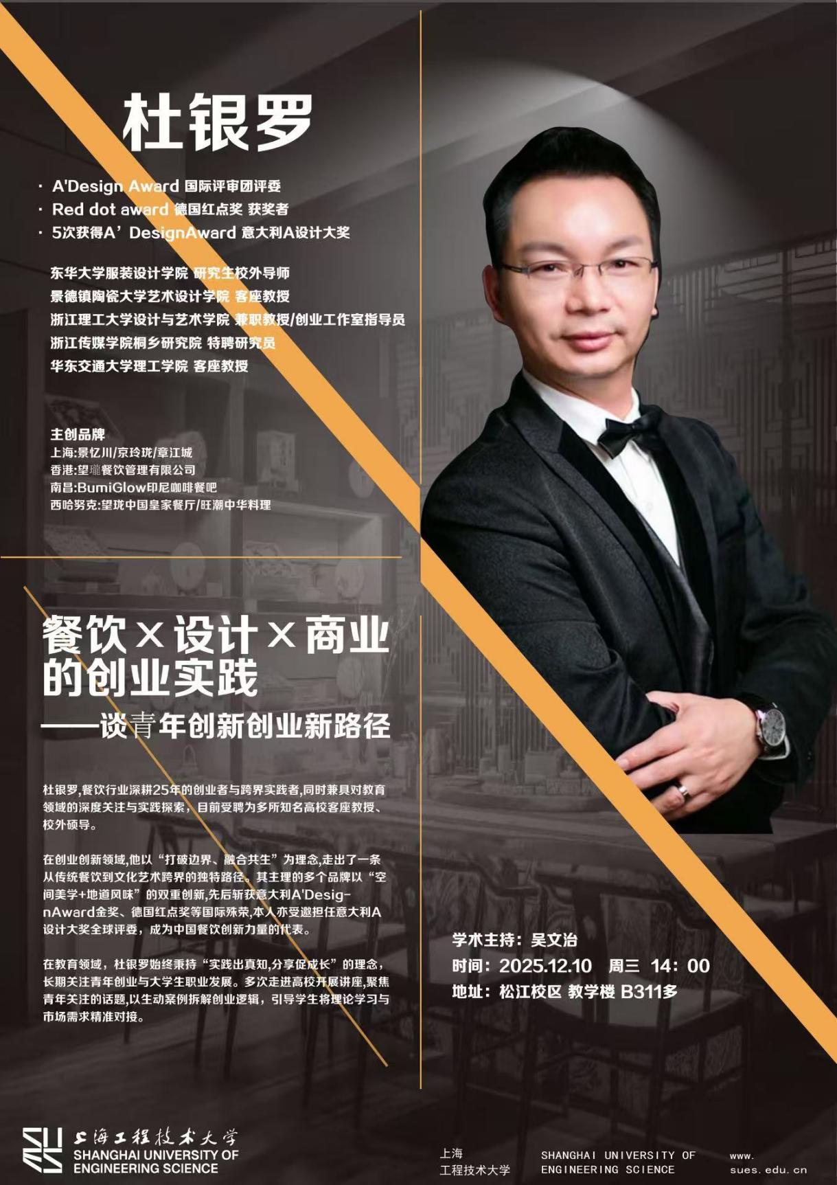 2025年12月10日,资深餐饮创业者、国际设计奖评委杜银罗走进上海工程技术大学校园,以“餐饮×设计×商业的创业实践——谈青年创新创业新路径”为题,为青年学子带来一场关于创新创业的深度分享。讲座中,他结合自身20年从业经历与多个品牌创立实践,系统阐述餐饮行业在当代的机遇与挑战,并为大学生指出可行的创业方向。