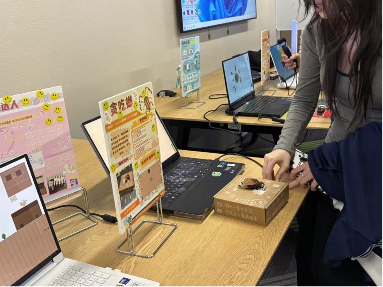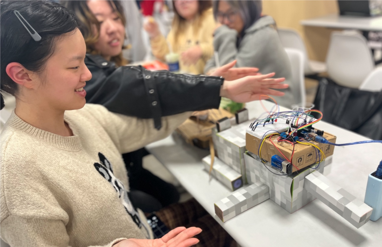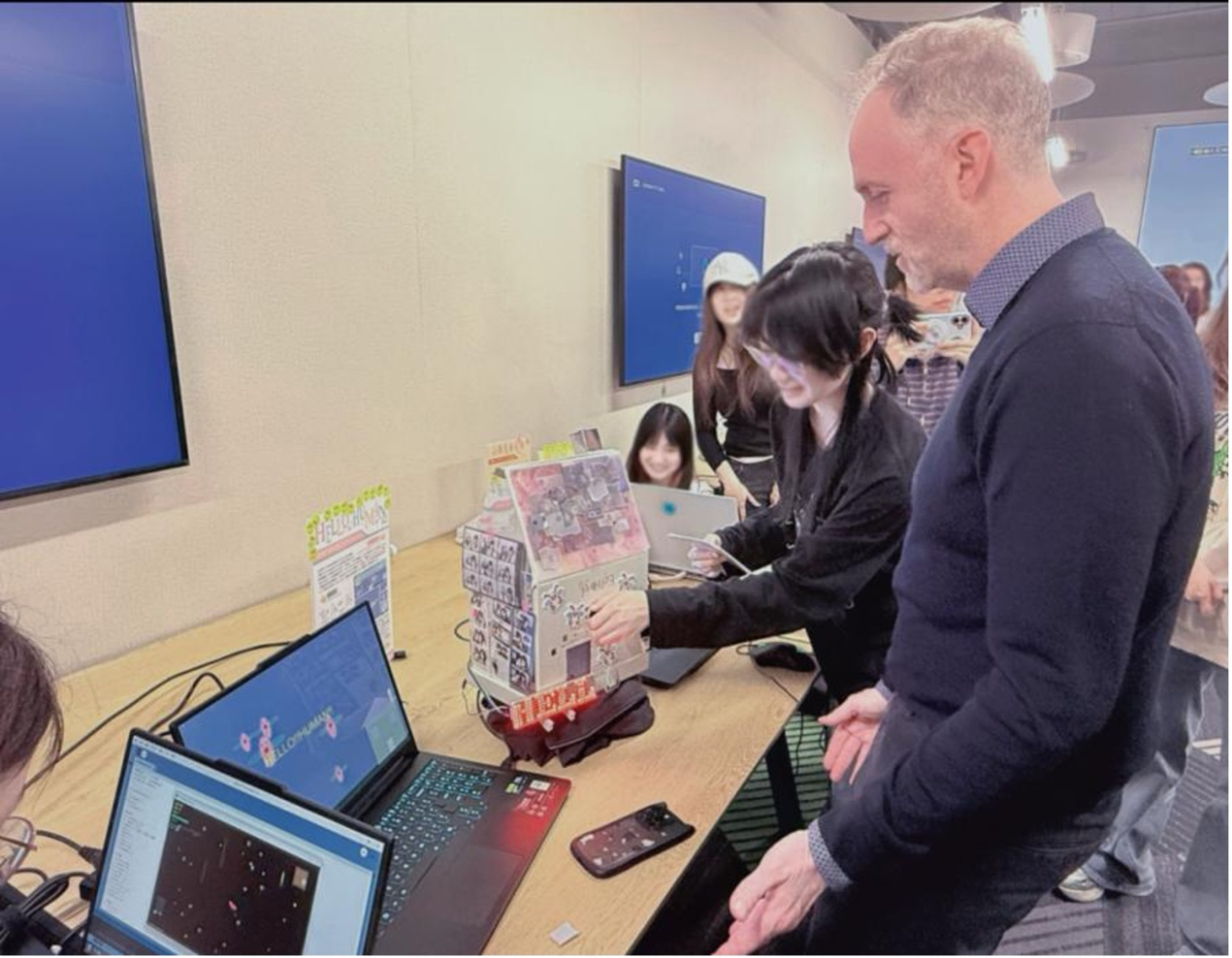在Joseph Press教授的引导下,同学们主动邀请设计、工程、管理等不同学科背景的师生体验自己设计的“小强”创意互动装置。基于Arduino、光敏电阻与舵机打造的“感知-反应”交互作品与VTuber直播间猫咪打蟑螂、像素风“莫蟑特”音乐游戏、爱吃糖果的惊吓盒子等作品同步亮相,创意纷呈,引发热烈反响——有人被逗笑,有人惊叫,电子电气工程学院同学主动上前协助调试舵机,原本陌生的师生在协作中自然破冰,现场流动着跨专业对话与默契。人机交互学组Olivier教授高度评价同学们展现出的超强动手能力与丰富创意,在场师生也表示传感器交互方式新颖有趣。正如JP教授所言:“Bugs Are the Beginning of Your Design Journey!”