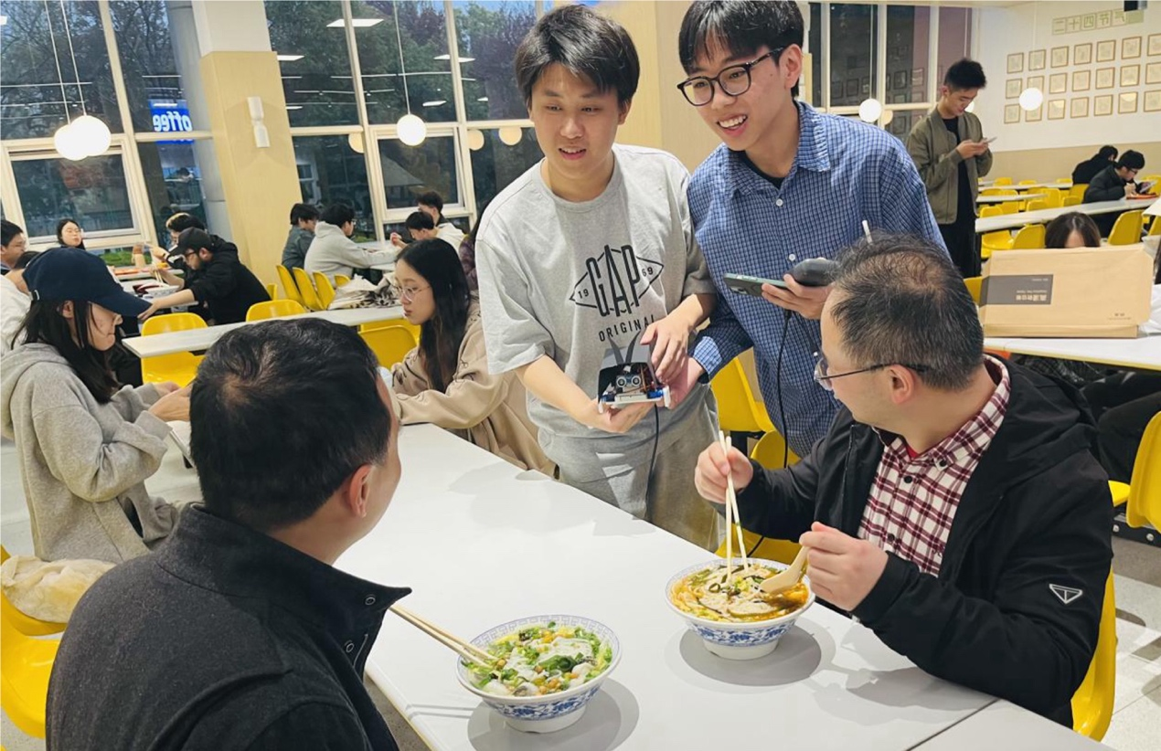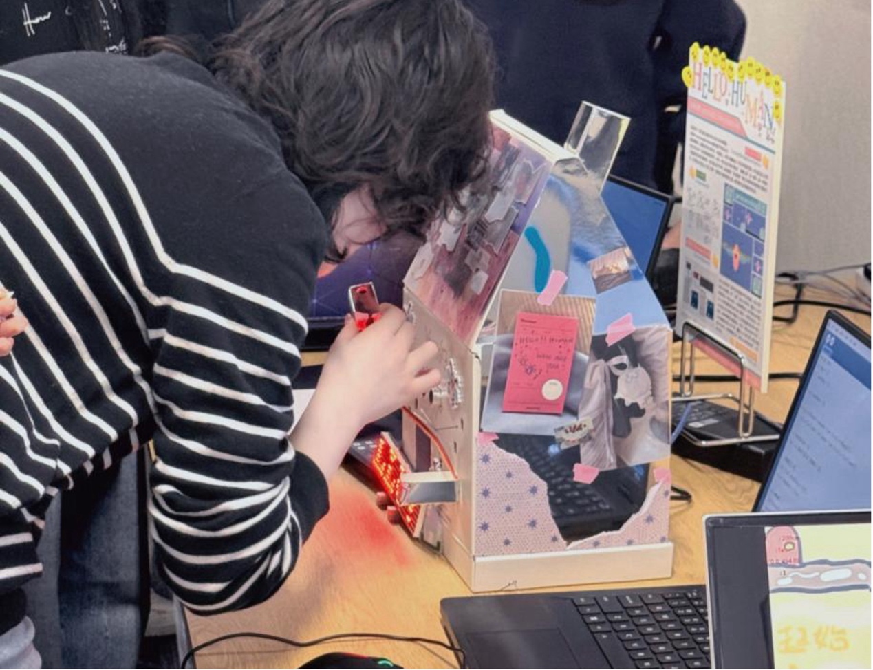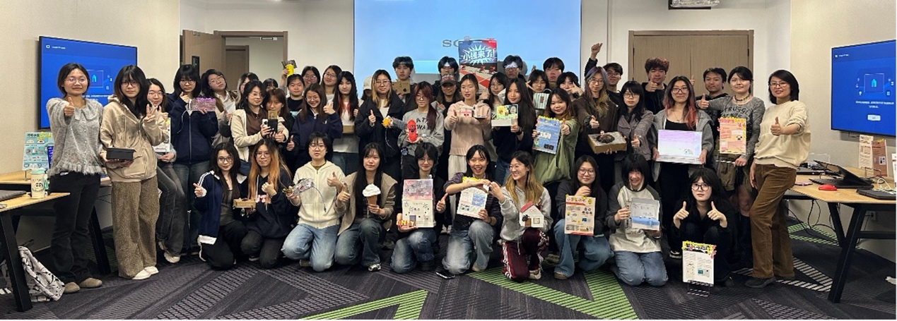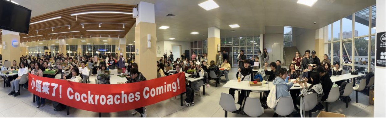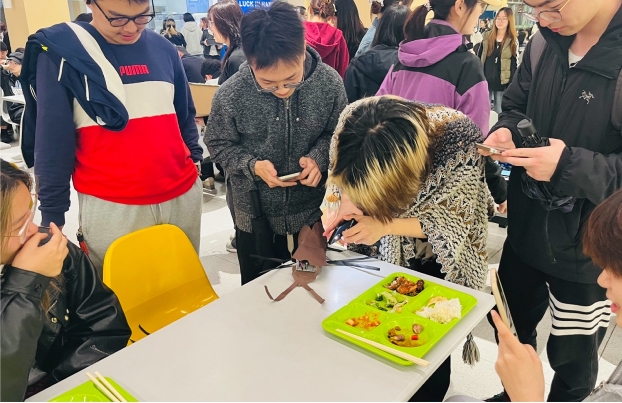 在Joseph Press教授的引导下,同学们主动邀请设计、工程、管理等不同学科背景的师生体验自己设计的“小强”创意互动装置。基于Arduino、光敏电阻与舵机打造的“感知-反应”交互作品与VTuber直播间猫咪打蟑螂、像素风“莫蟑特”音乐游戏、爱吃糖果的惊吓盒子等作品同步亮相,创意纷呈,引发热烈反响——有人被逗笑,有人惊叫,电子电气工程学院同学主动上前协助调试舵机,原本陌生的师生在协作中自然破冰,现场流动着跨专业对话与默契。人机交互学组Olivier教授高度评价同学们展现出的超强动手能力与丰富创意,在场师生也表示传感器交互方式新颖有趣。正如JP教授所言:“Bugs Are the Beginning of Your Design Journey!”