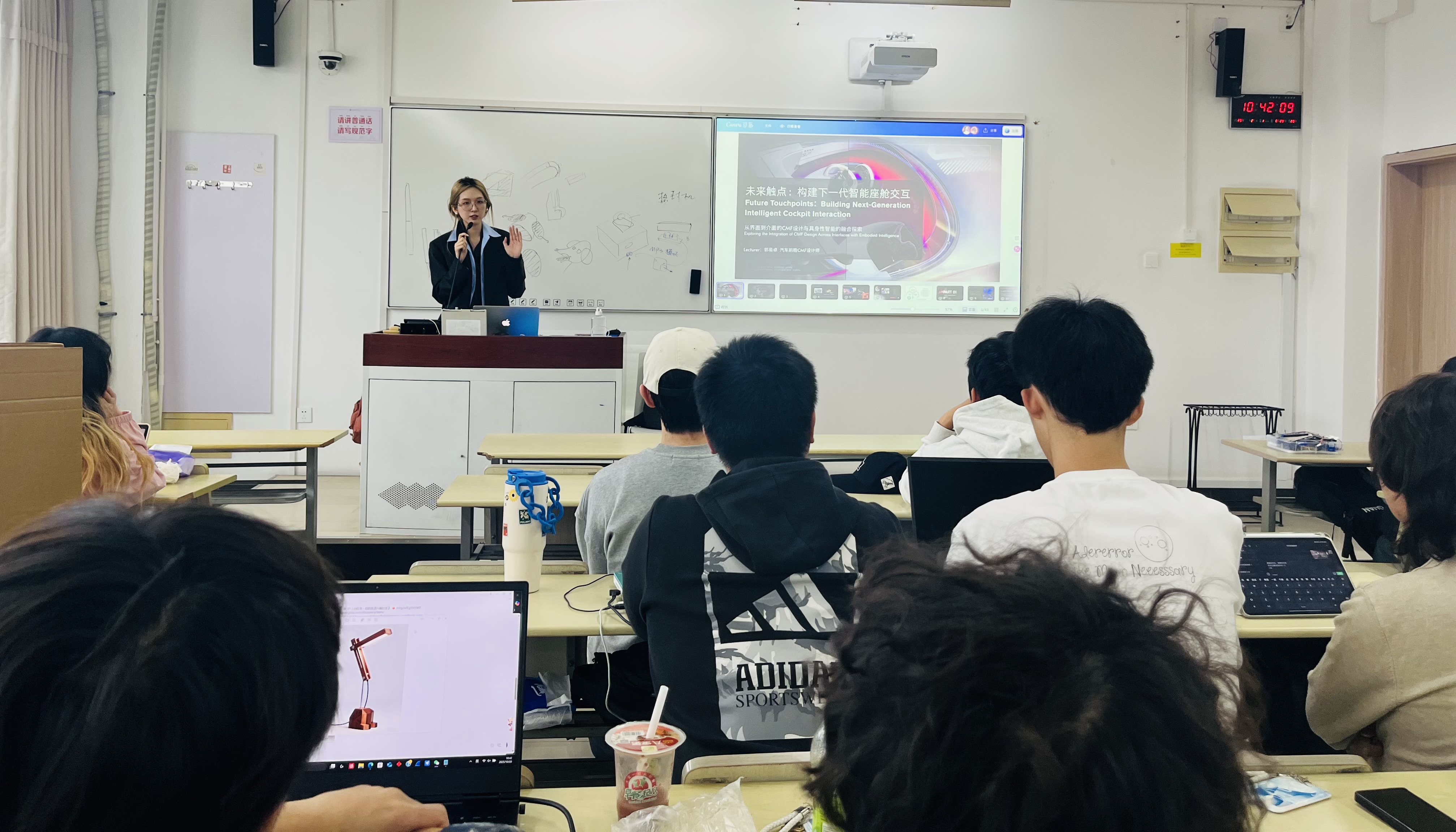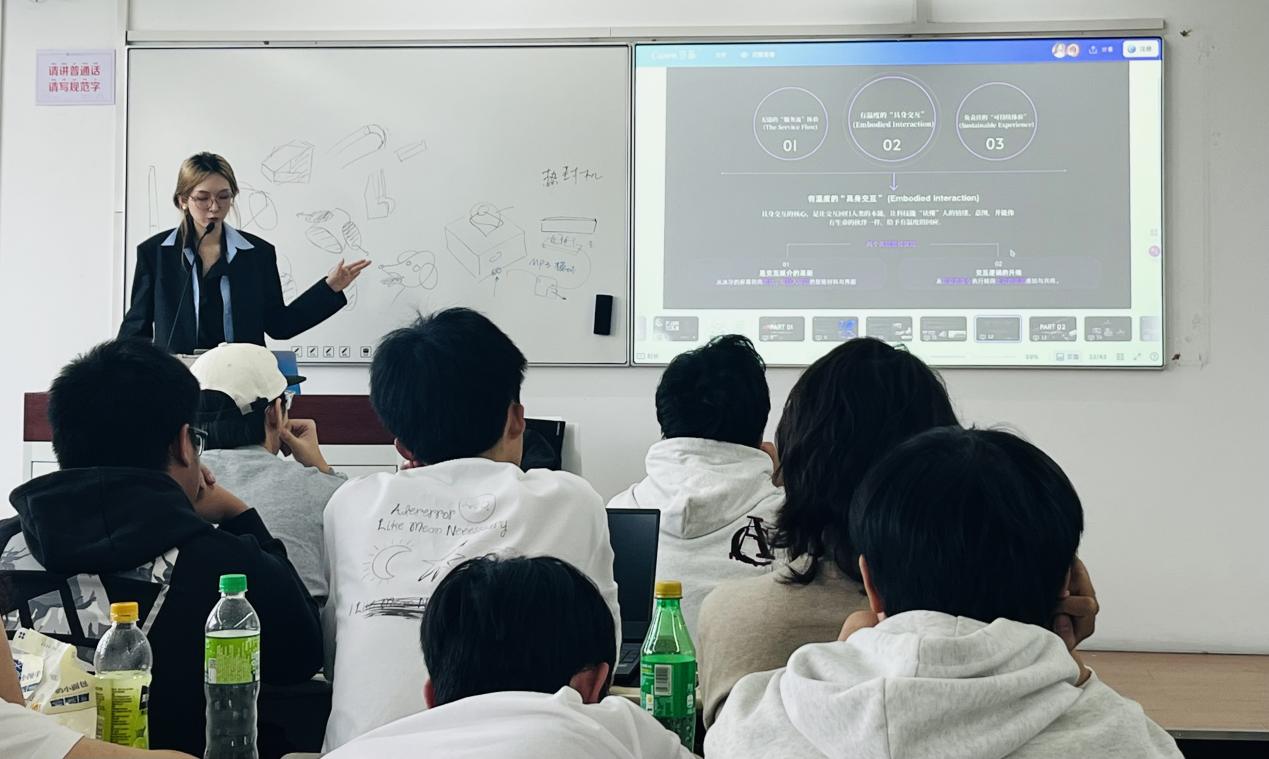 On October 20, 2025, the course invited interdisciplinary designer, materials innovation researcher, and CMF Designer from SAIC-GM-Wuling Forward Looking Center, Guo Yizhuo, to the classroom. Under the theme "CMF Design for Smart Cockpits and Innovation in Future Interaction Touchpoints," she unlocked cutting-edge technologies and design logic in the smart automotive field for industrial design students, building a bridge between classroom theory and forefront industry practice.
